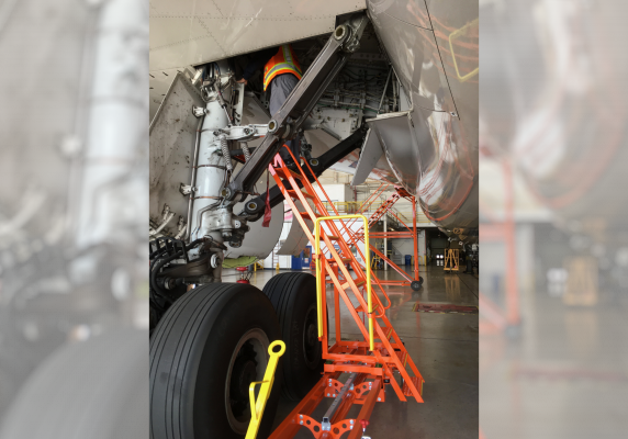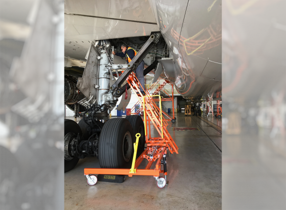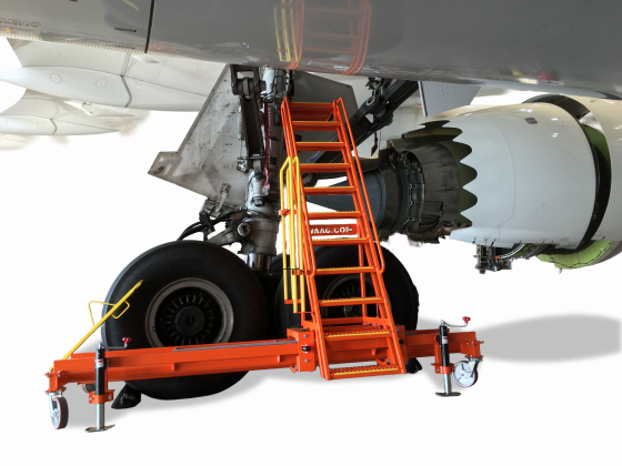 Our unique design features a ladder that can slide laterally 42″, in 3″ increments to access B777 / B787 landing gear access and B777 trunnion lube points.